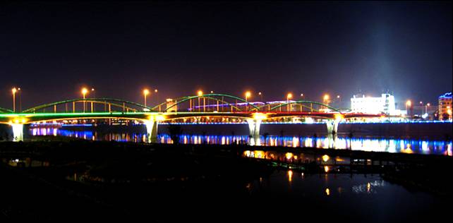觀光索橋:全長約280米,寬4.5-5米,兩座主塔分別有兩層觀光平臺。站在觀光索橋上,可以縱情欣賞黃山外灘的宜人景色、遠眺新安江水天際合一的美景。橋的對面河畔,有人工瀑布,它以自然式的布局手法將山水瀑布與新安江融為一體,飛流直下,氣勢恢弘,再配上燈光色彩的變化,成為新安江上視覺的焦點,讓古老的新安江在新時期流光溢彩,煥發(fā)出新的生機和活力。還有一座水晶橋,長40米,寬5米,它是以鋼架為結構,外包玻璃,將亮化等全部至于玻璃內,使整座橋晶瑩剔透,給新安江增添了一道亮麗的風景線。