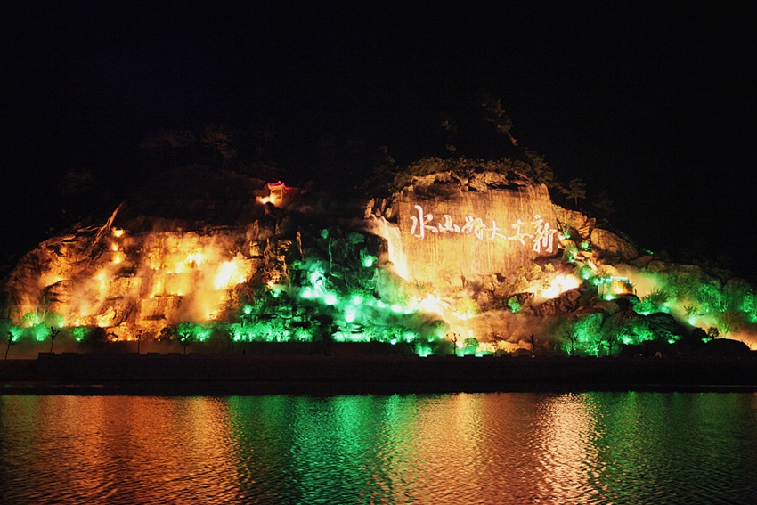 摩崖石刻:這里九龍山臨江而立,在過去是一處地質災害點。結合地質災害治理,因地制宜,變廢為寶,將其打造成大型塑山文化景觀工程。在其最大的一個斷面上雕刻徽州歷史名人朱熹的手書“新安大好山水”,其中這個“新”字高11米,相當于4層樓的高度,另一斷面上雕刻“新安畫派名家題壁”,將自明清以來原籍徽州的23位新安畫派名家手書題名匯集起來鐫刻于此,以示后人景仰。沿著崖壁邊緣山體上修建登山步道,在摩崖石刻前設置觀景平臺,游人可由遠而近參觀。同時,在崖壁配置以相應的亮化,無論是白天,還是夜晚,都能觀賞到這一文化景觀。