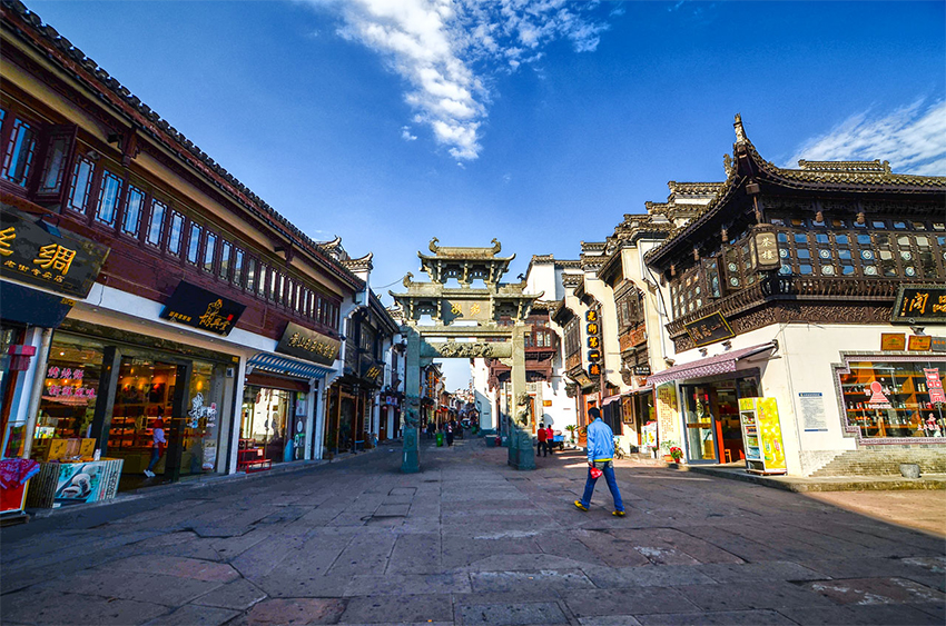 老街:我們的游船開始在這緩緩的掉頭了,屯溪老街始建于宋代、明清時期發(fā)展為徽州物資集散中心。老街中的店鋪密集,店面、作坊、住宅三位一體,保留古代商家“前店后坊”或“前鋪后戶”的經營格局和特色,老街街道縱橫交錯,構成魚骨架,交通十分方便,它是國內目前保存較為完好的一條具有宋、明、清建筑風格的古商業(yè)街,被列為全國歷史文化保護街區(qū),它全長1273米,精華部分832米,寬5—8米,被譽為流動的“清明上河圖”,現由于城市規(guī)劃,市委市政府對老街進行了綜合改造,將其功能定位為“文化展示區(qū)、商貿區(qū)、休閑旅游體驗區(qū)、特色小吃區(qū)”,老街周圍的一馬路、二馬路和三馬路也隨之進行了改造,一馬路以市井風情、民俗為主題的古玩特色街,二馬路以茶吧、咖啡吧、酒吧、書吧為主的休閑體驗街,如今,改造完成后,形成了“一條古街、三種風情”。