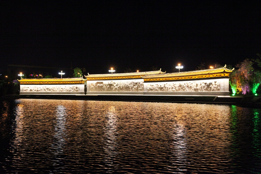 徽州歷史悠久,人才輩出,徽文化是我國三大地域文化之一。為深入挖掘、形象展示、傳承弘揚(yáng)底蘊(yùn)深厚的徽州傳統(tǒng)文化和濃郁的古徽州地方特色,在這里設(shè)置了下沉式廣場,廣場面積約4000平方米。廣場上設(shè)計(jì)了一組大照壁,它由中間主照壁和兩邊分列照壁3塊組成,總長為108米,單面面積為800平方米,總面積為1600平方米,是迄今為止中國最大的徽派照壁。